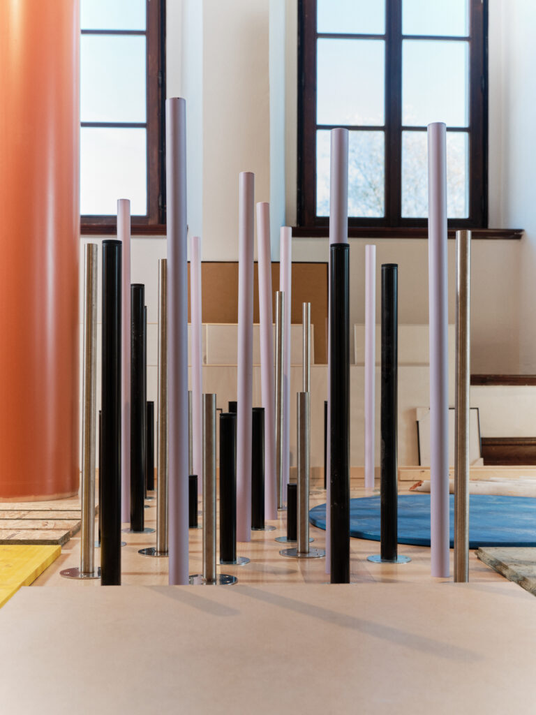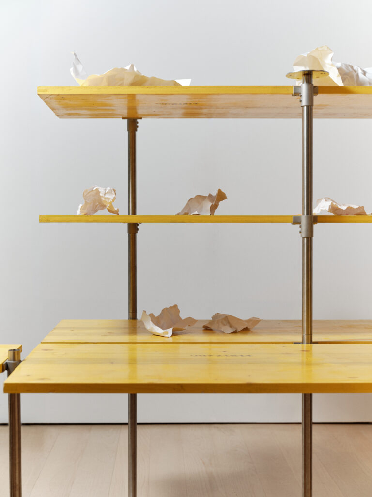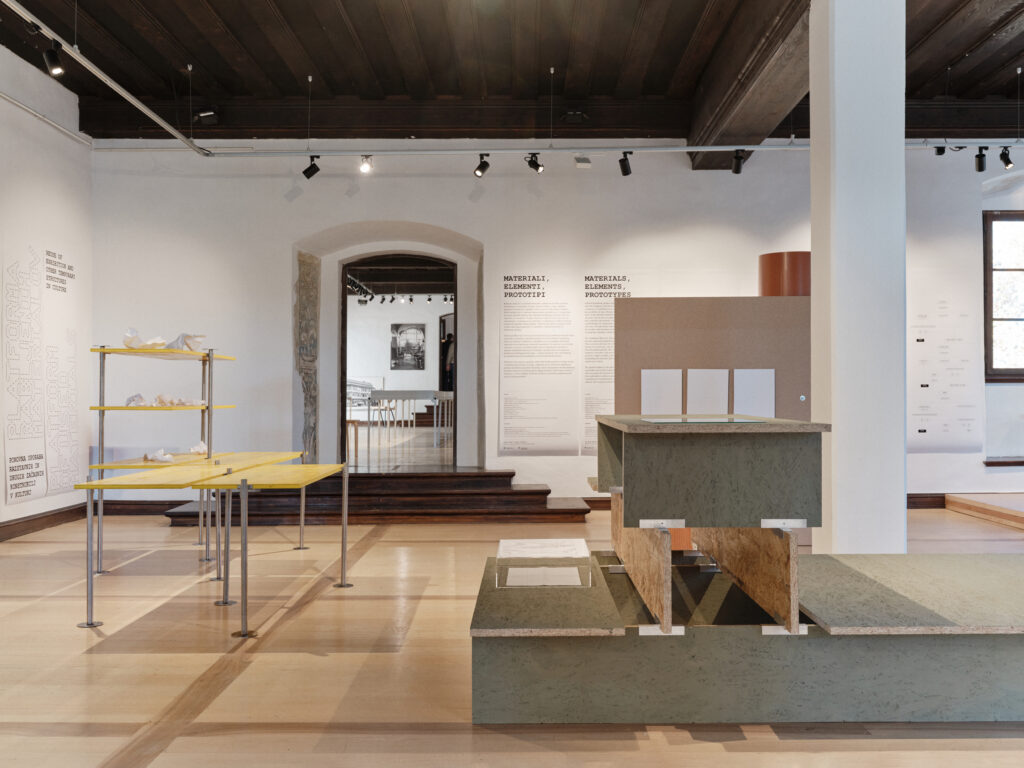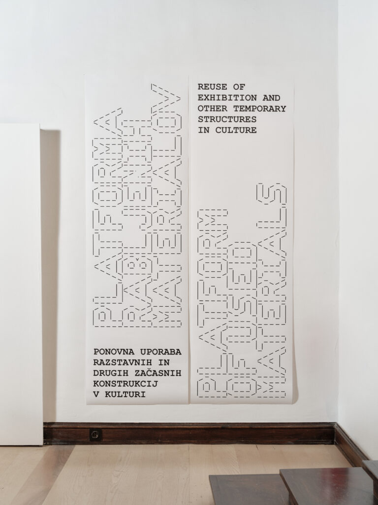 The installation Materials, Elements, Prototypes for the first time publicly presents categorised materials and elements from the museum’s depot. These served as the basis for a three-week workshop for students from the Faculty of Architecture, who developed prototypes of exhibition structures from discarded materials. The workshop tested guidelines for the design of temporary structures, such as modularity, the use of standard dimensions and elements, simple assembly, and reversible fastening methods, with the aim of dismantling the structures after use and reusing them as resources for new spatial interventions.